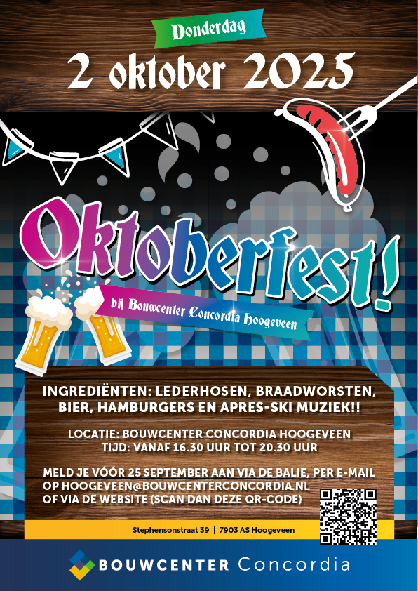 Het is Oktoberfest bij Bouwcenter Concordia Hoogeveen! Kom langs voor een biertje in onze Biergarten, worst of gehaktballen van de grill en natuurlijk apres-ski muziek!